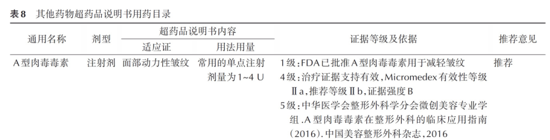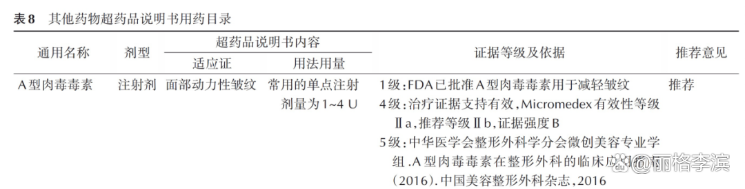 从表中可见,该“专家共识”以“常用单点注射剂1-4U的用法用量,将A型肉毒素应用范围扩大到面部动力性皱纹”。